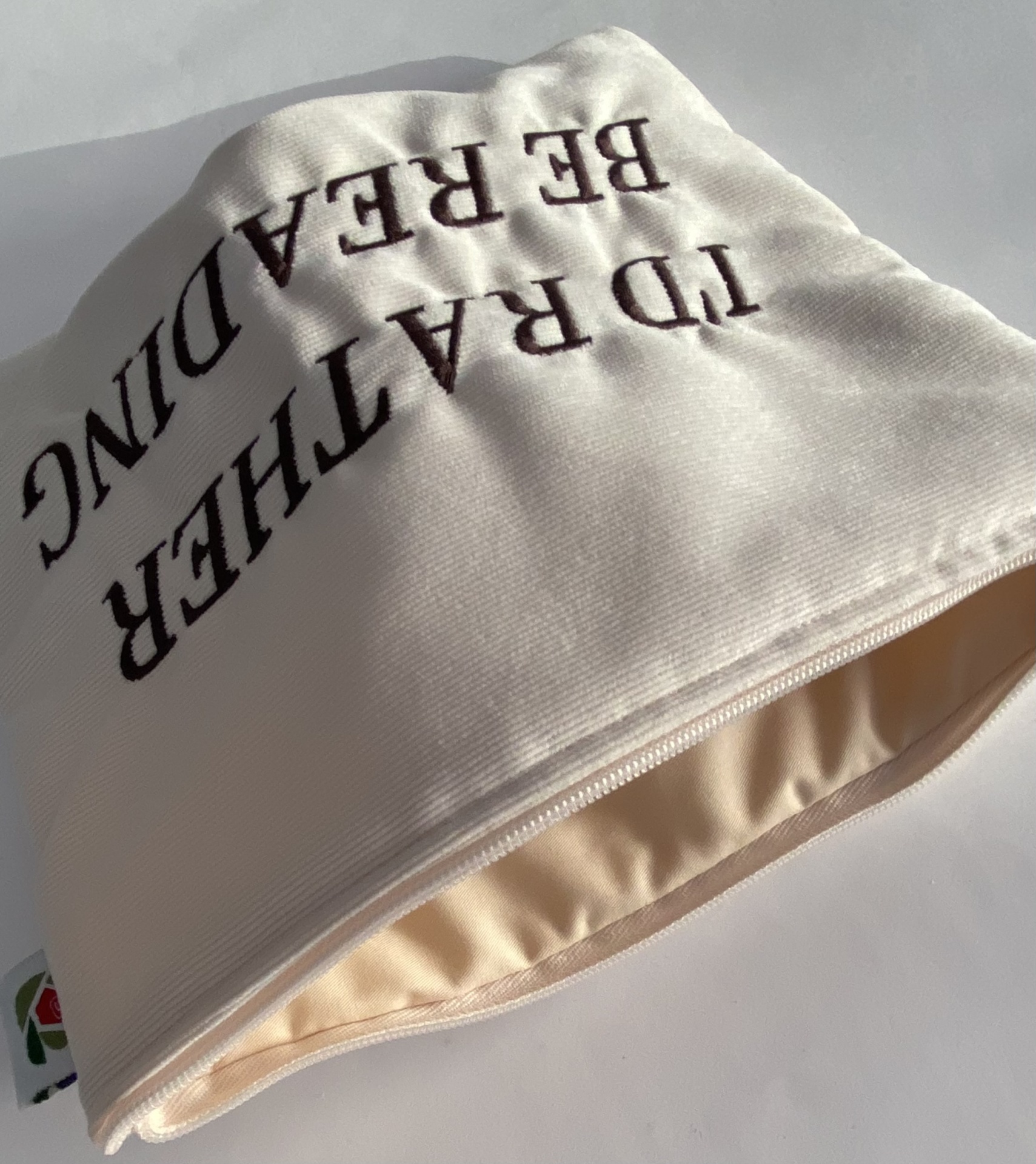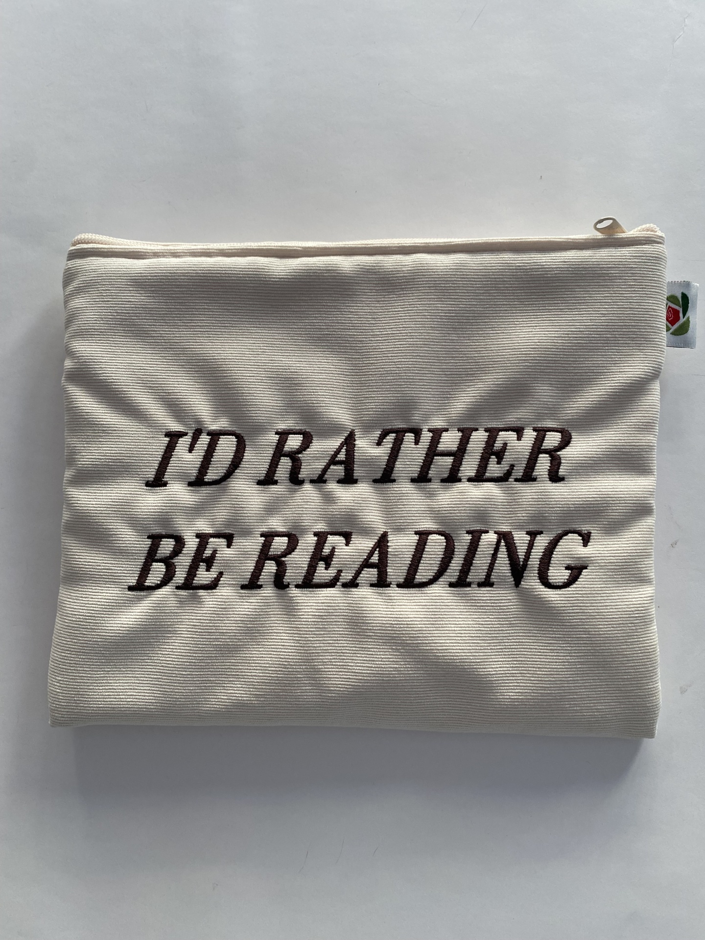 Apresenta um tecido exterior de bombazine bege com a frase alusiva à leitura "I'd rather be reading" bordada a castanho. O tecido interior e o fecho são beges.
