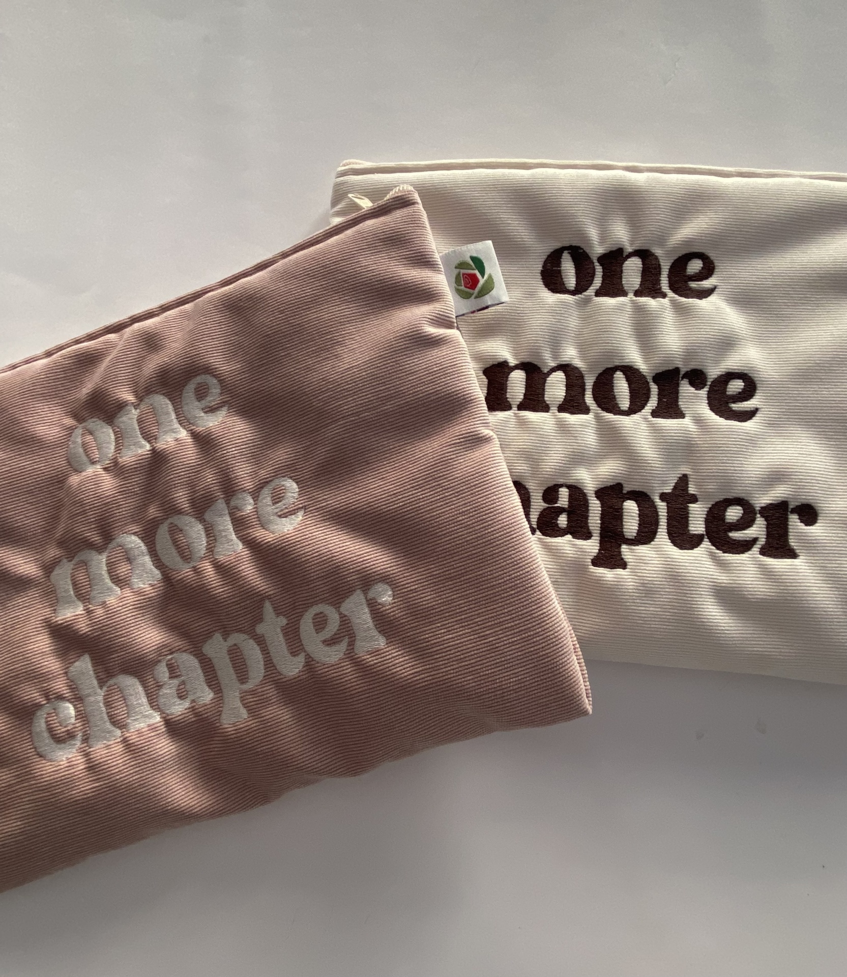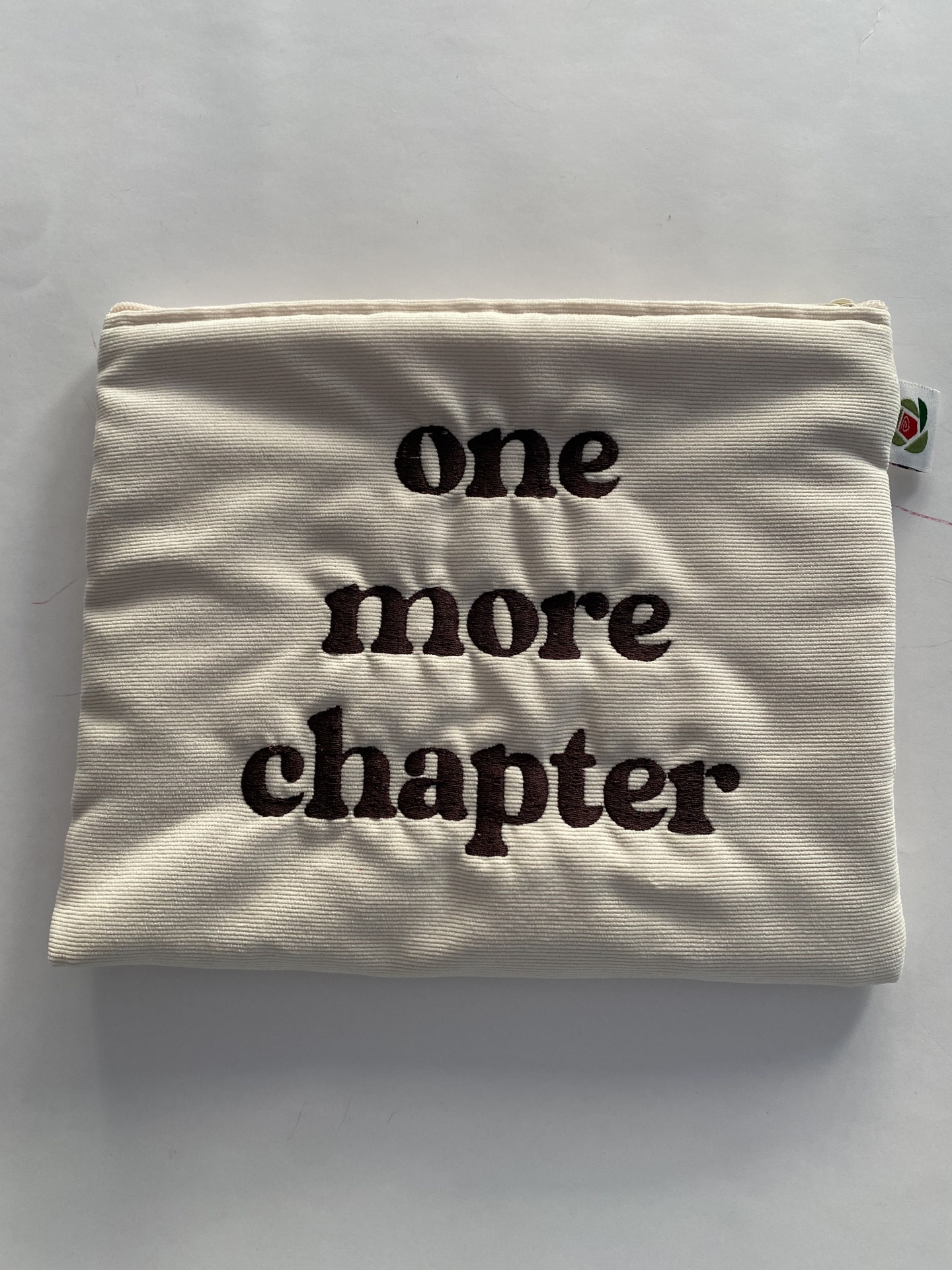 Apresenta um tecido exterior de bombazine bege com a frase alusiva à leitura "one more chapter" bordada a castanho. O tecido interior e o fecho são beges.