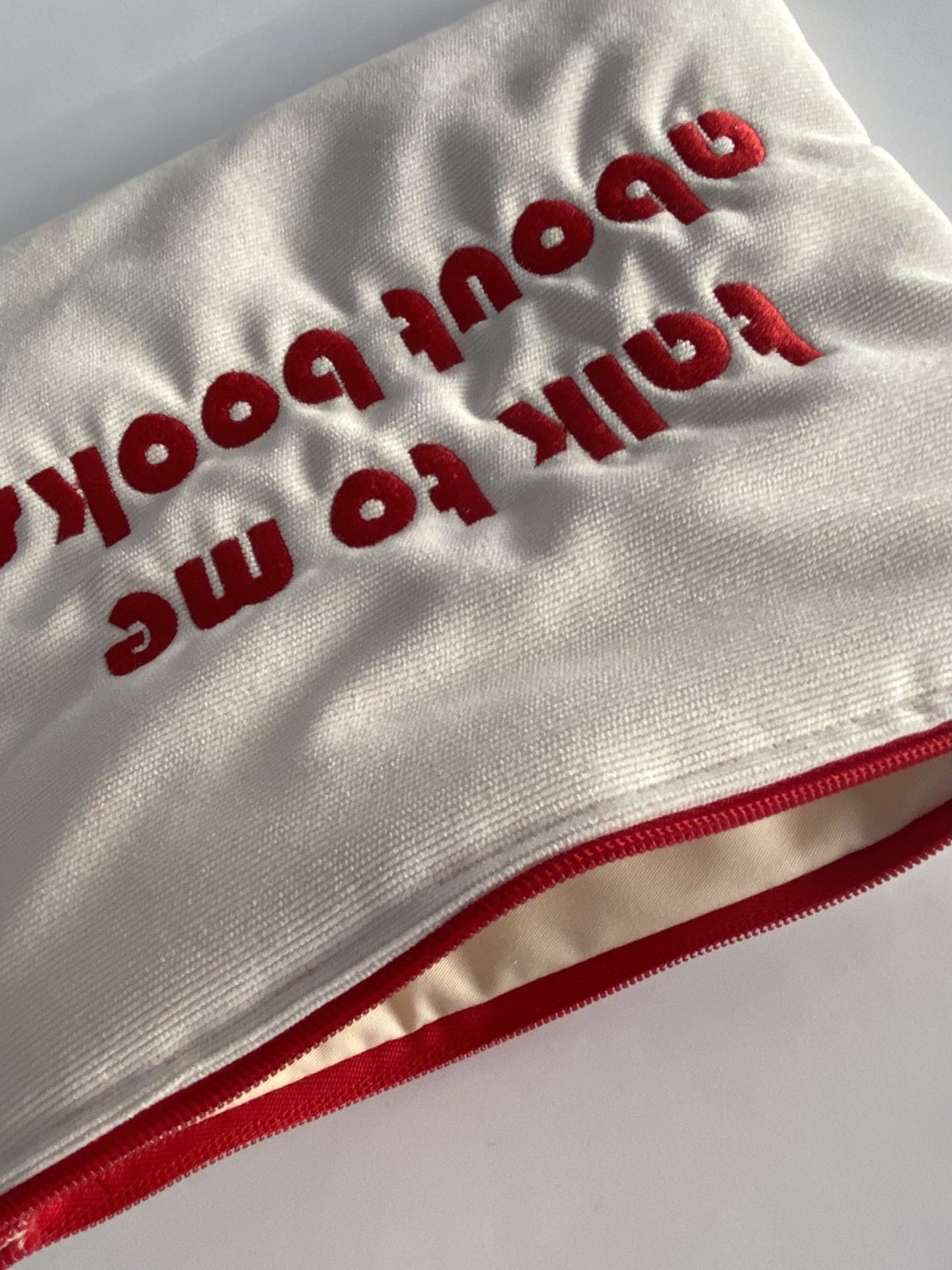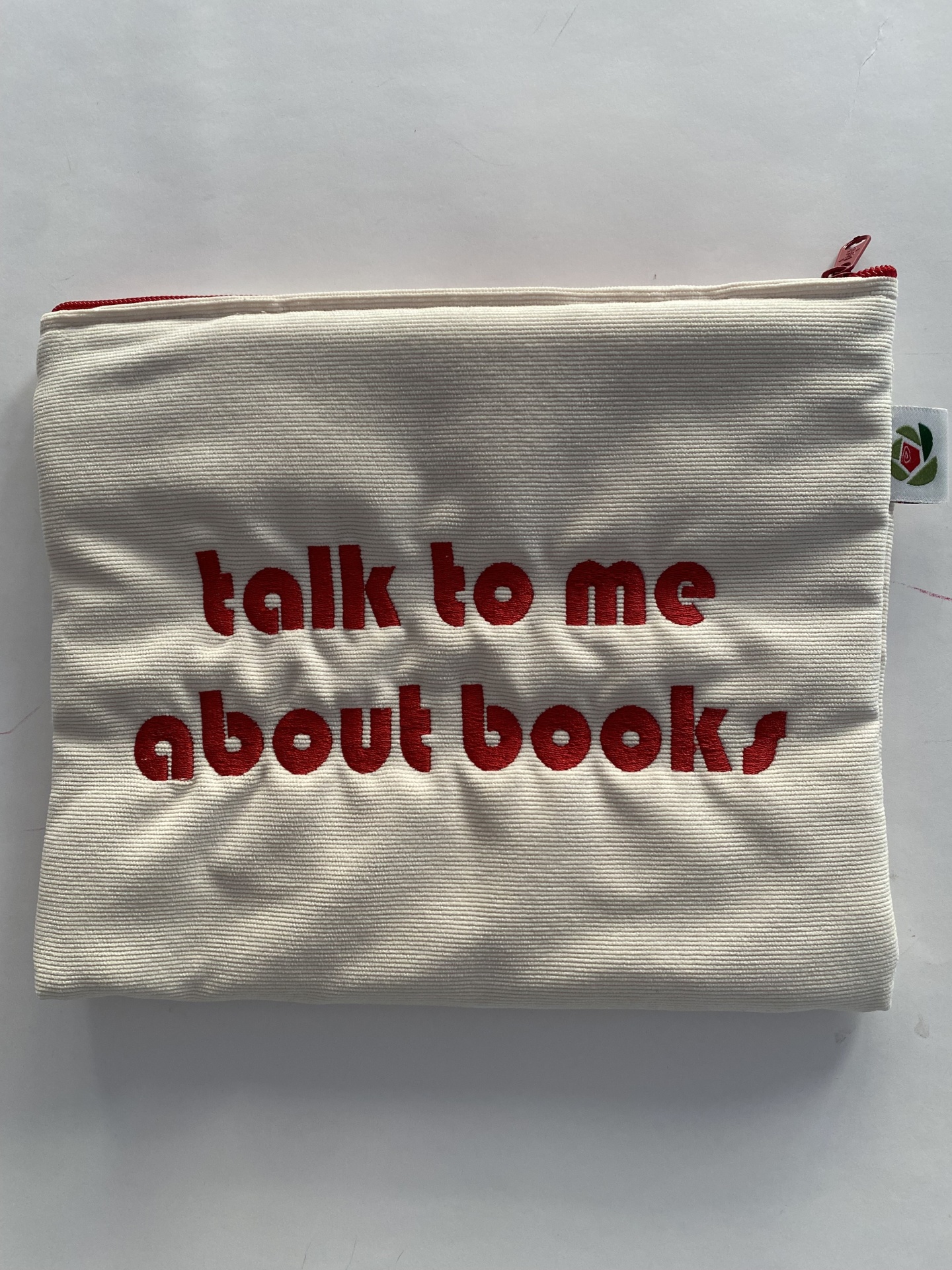Apresenta um tecido exterior de bombazine bege com a frase alusiva à leitura "talk to me about books" bordada a encarnado. O tecido interior é bege e o fecho é encarnado.