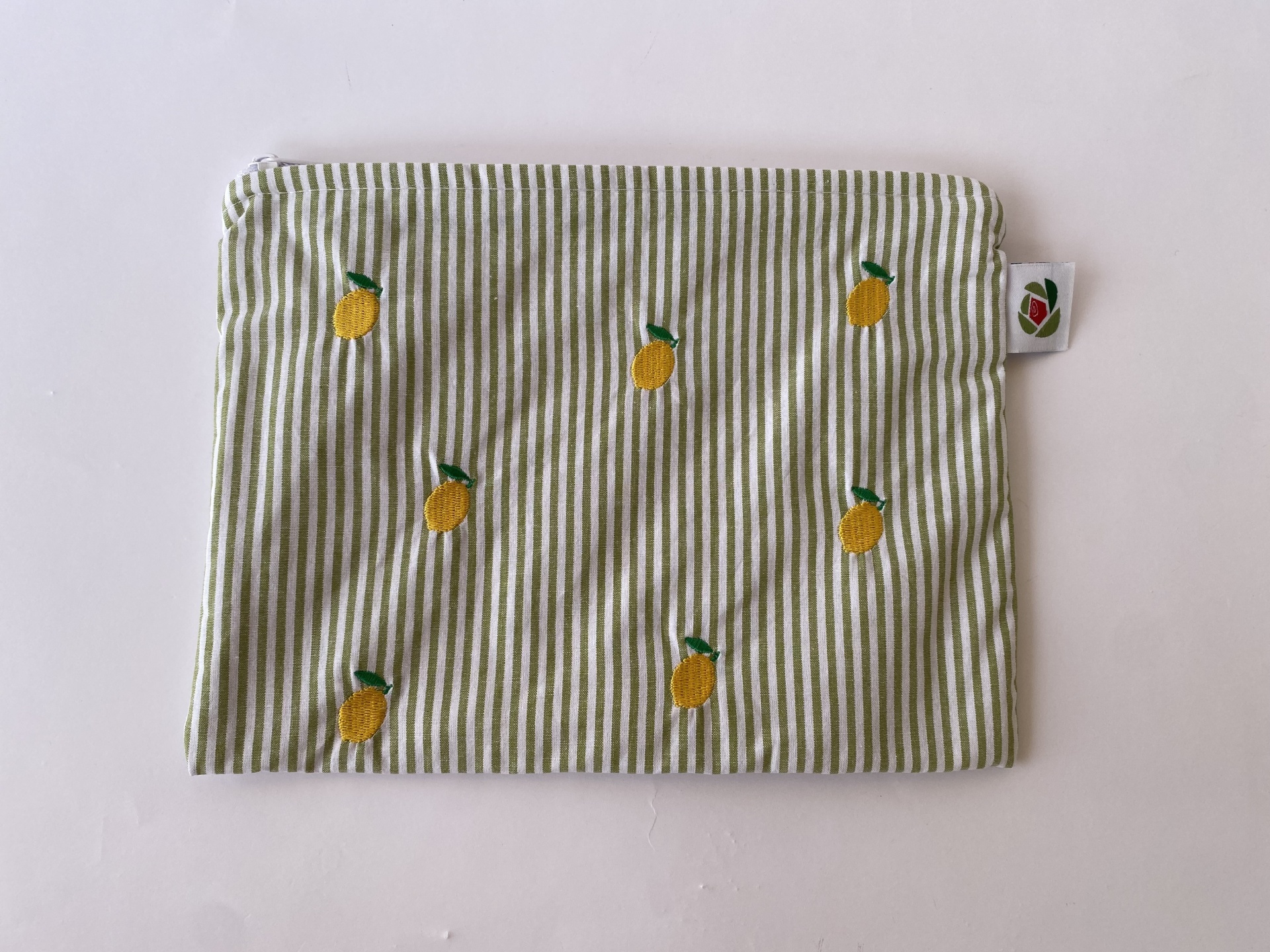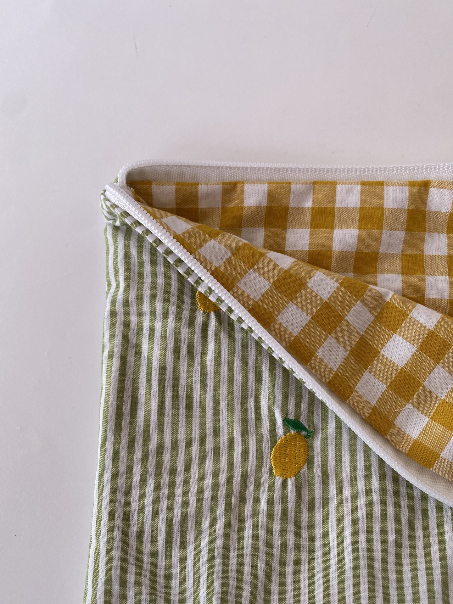Apresenta um tecido exterior é às riscas verdes e brancas com limões bordados dos dois lados. O tecido interior é ao xadrez amarelo e branco. O fecho é branco.