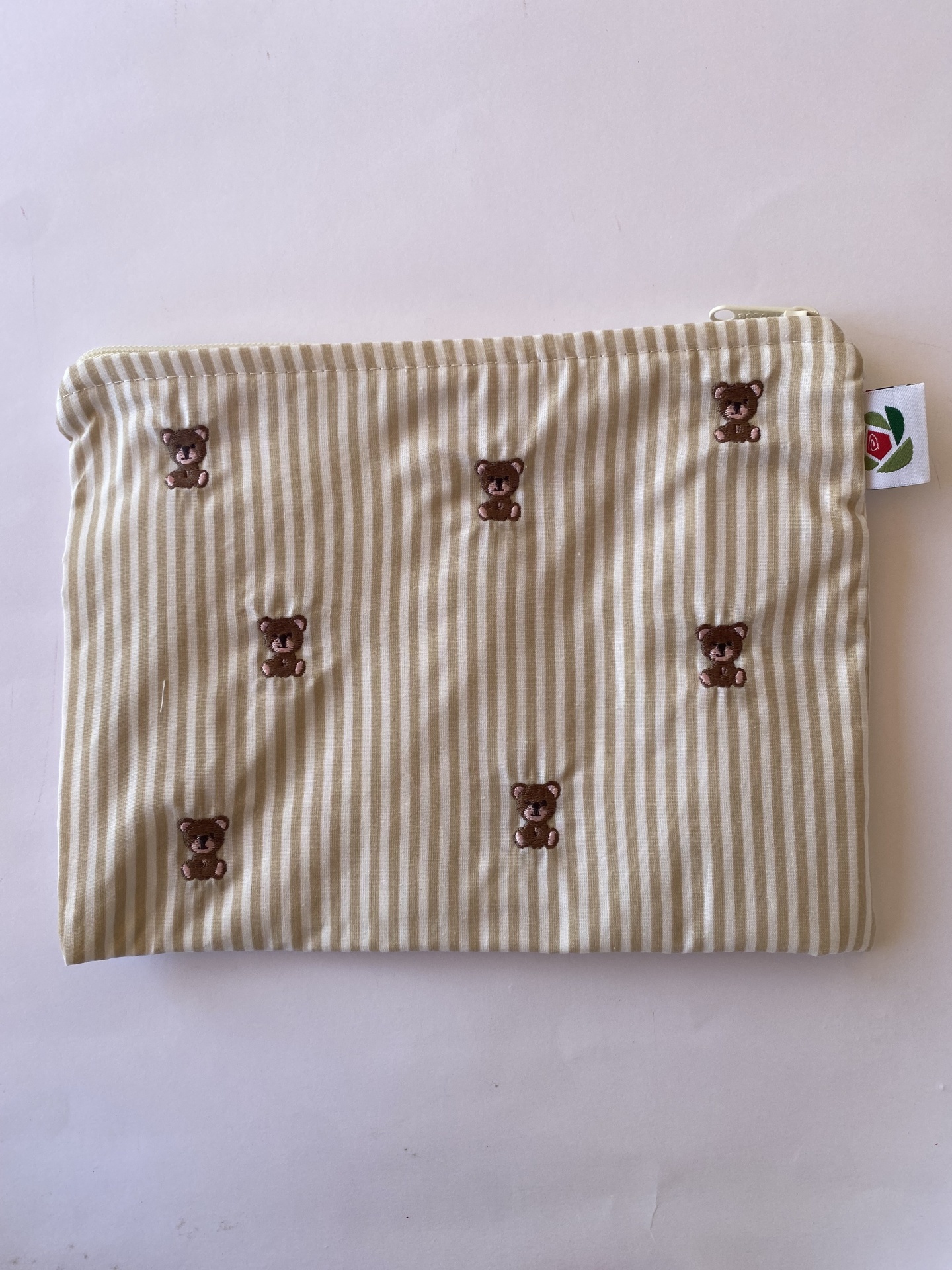 Apresenta um tecido exterior é às riscas bege e brancas com ursinhos bordados dos dois lados. O tecido interior apresenta um desenho floral com tons bege e castanhos. O fecho é bege.