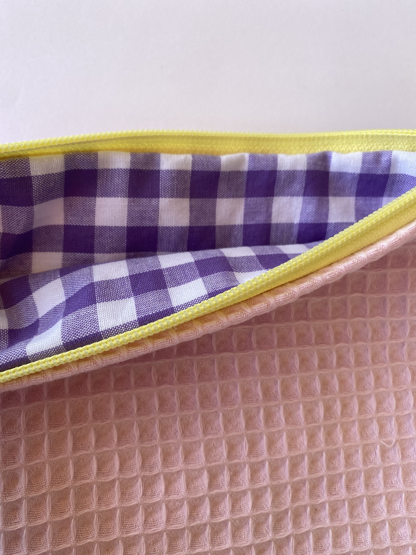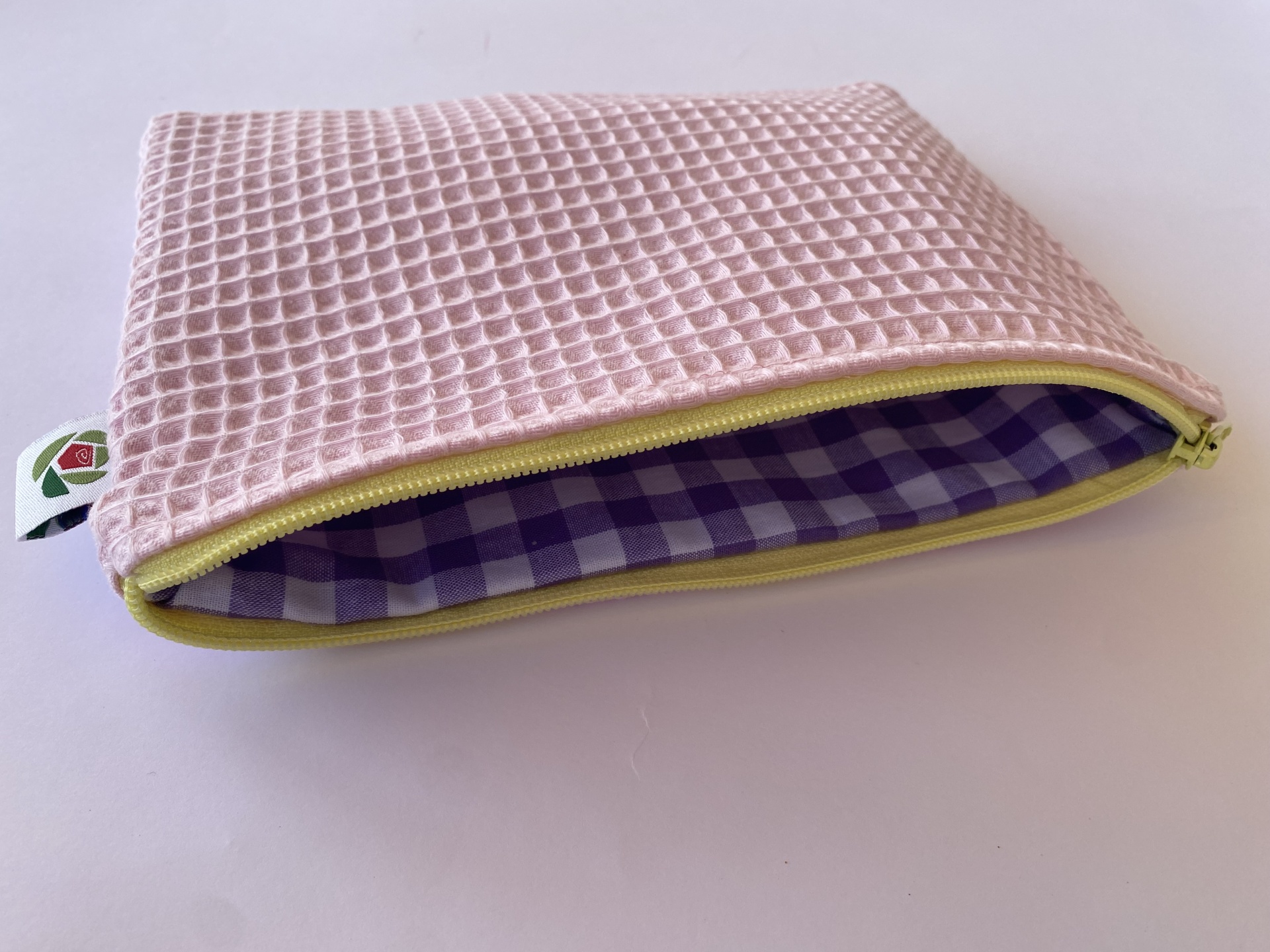 Apresenta uma combinação de tecido exterior com textura waffle em cor de rosa, e de tecido interior com xadrez roxo e branco. O fecho é amarelo para um maior contraste de cores!