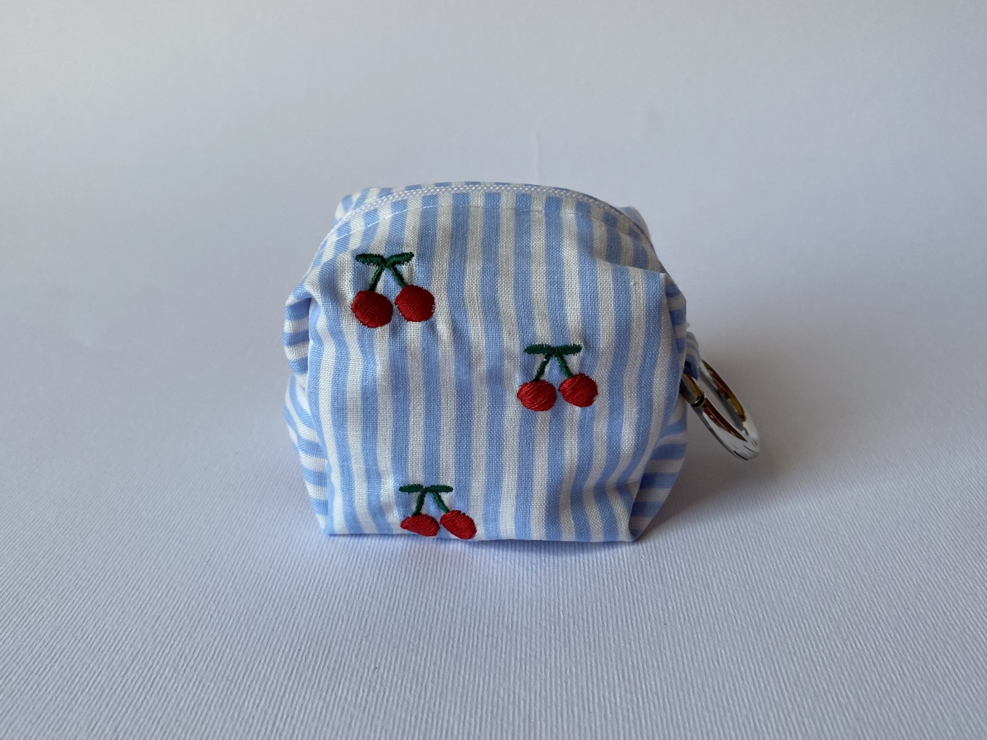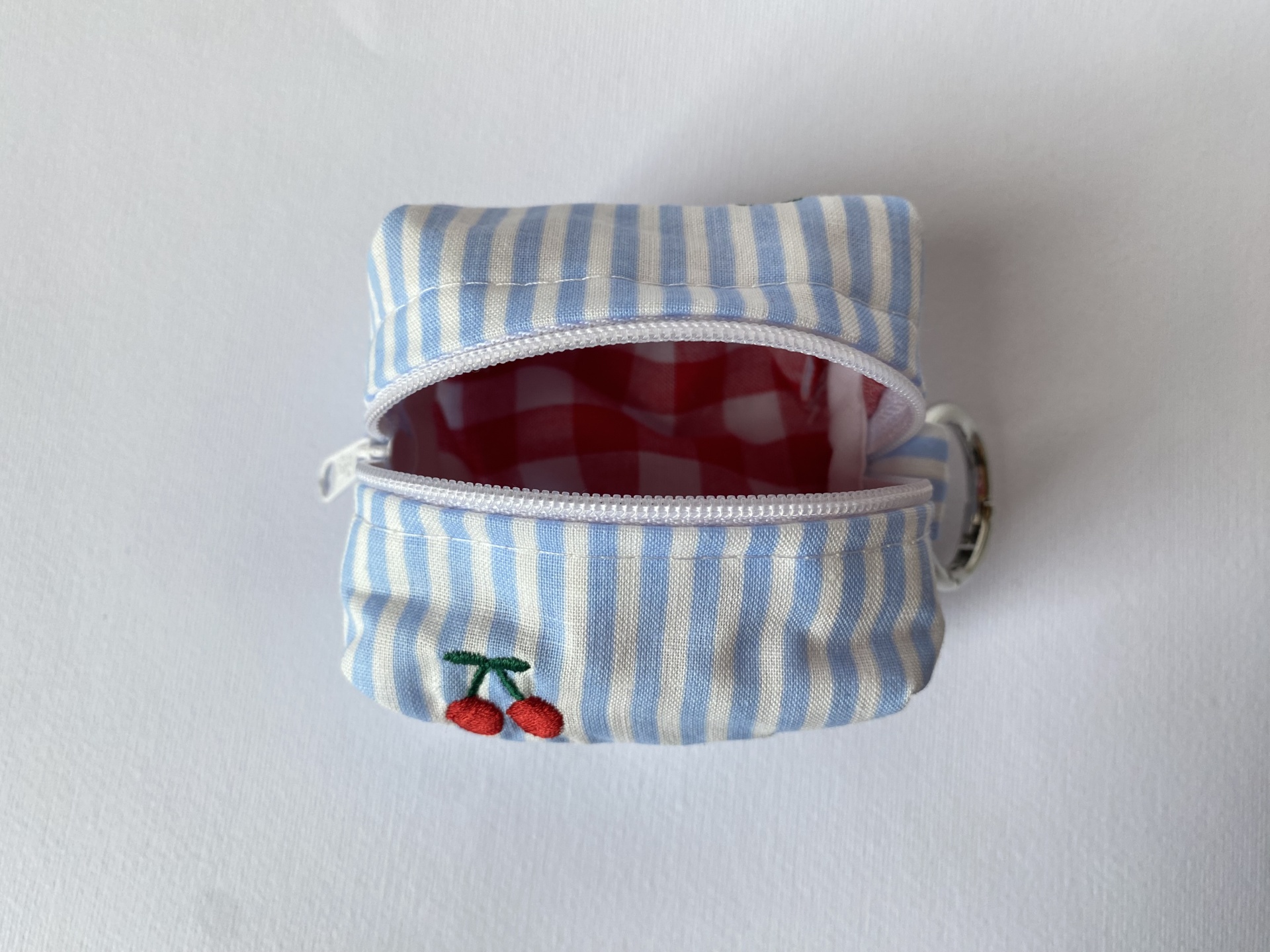 Apresenta um tecido exterior às riscas azuis e brancas com cerejas bordadas dos dois lados. O tecido interior é ao xadrez vermelho e branco. O fecho é branco.