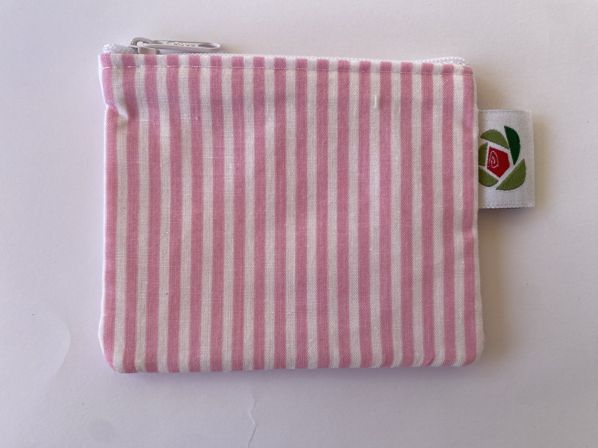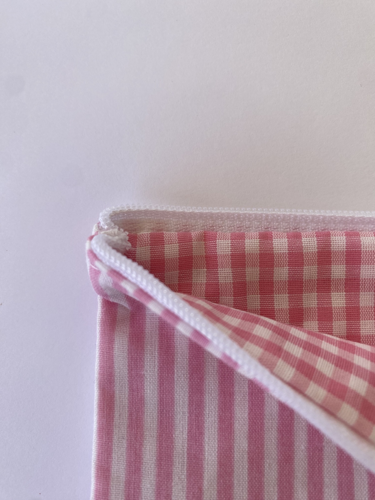 Apresenta um tecido exterior às riscas rosa e brancas com a frase "everything is prettier" bordada num lado. O tecido interior é xadrez rosa e branco. O fecho é branco.