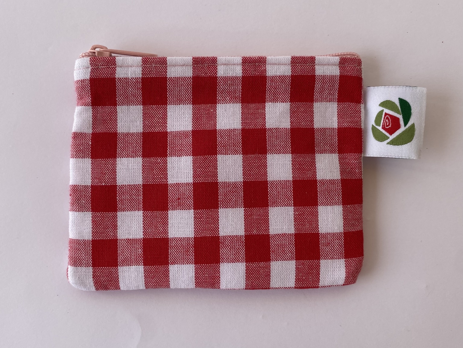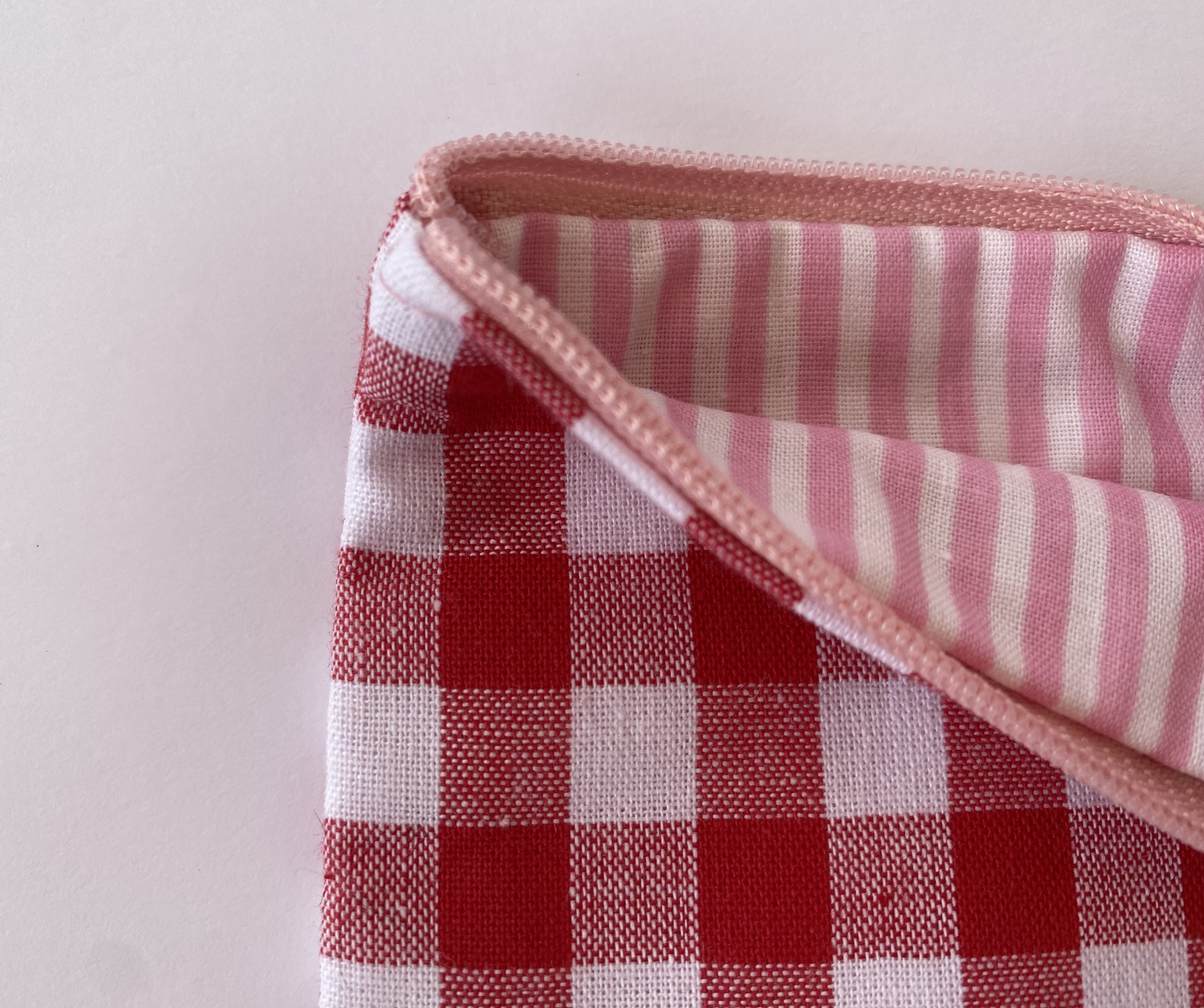 Apresenta um tecido exterior xadrez encarnado e branco com a frase "Just girly things" bordada num lado. O tecido interior é às riscas rosa e brancas. O fecho é branco.
