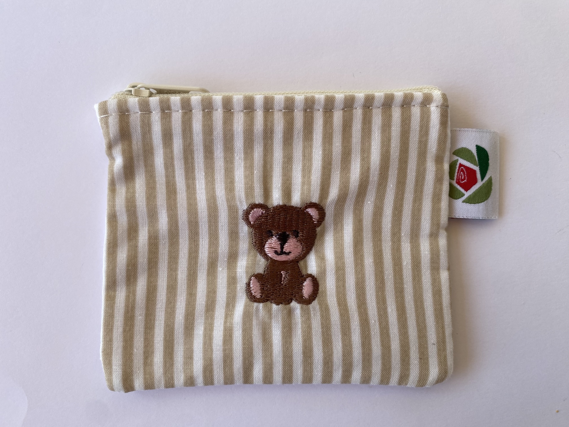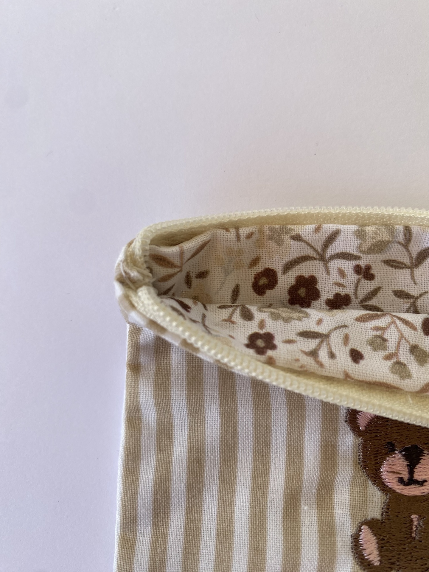 Apresenta um tecido exterior às riscas bege e brancas com um urso bordado no centro. O tecido interior é floral em tons bege e castanhos. O fecho é bege.