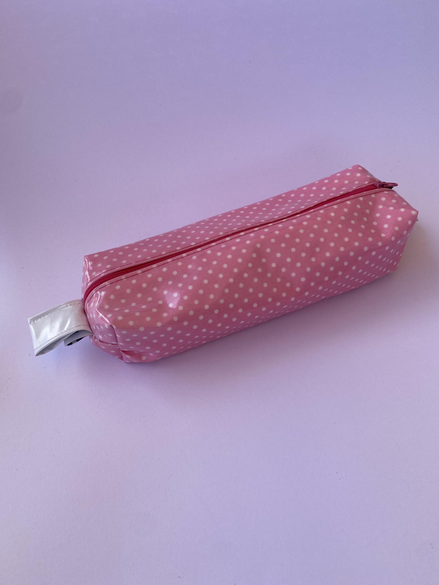 Estojo tecido plastificado rosa c/ bolas brancas