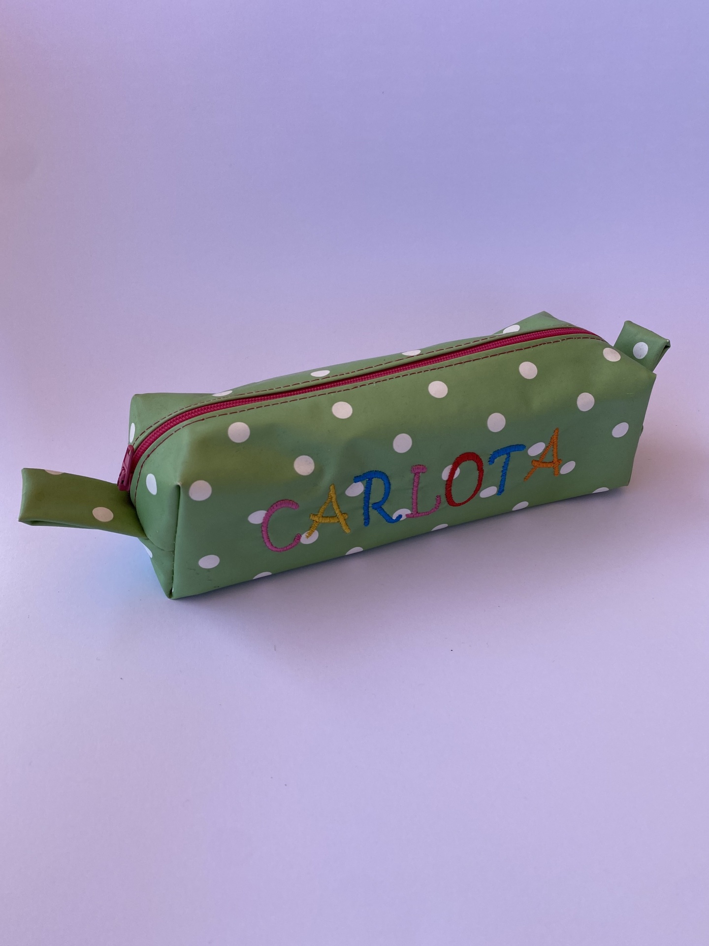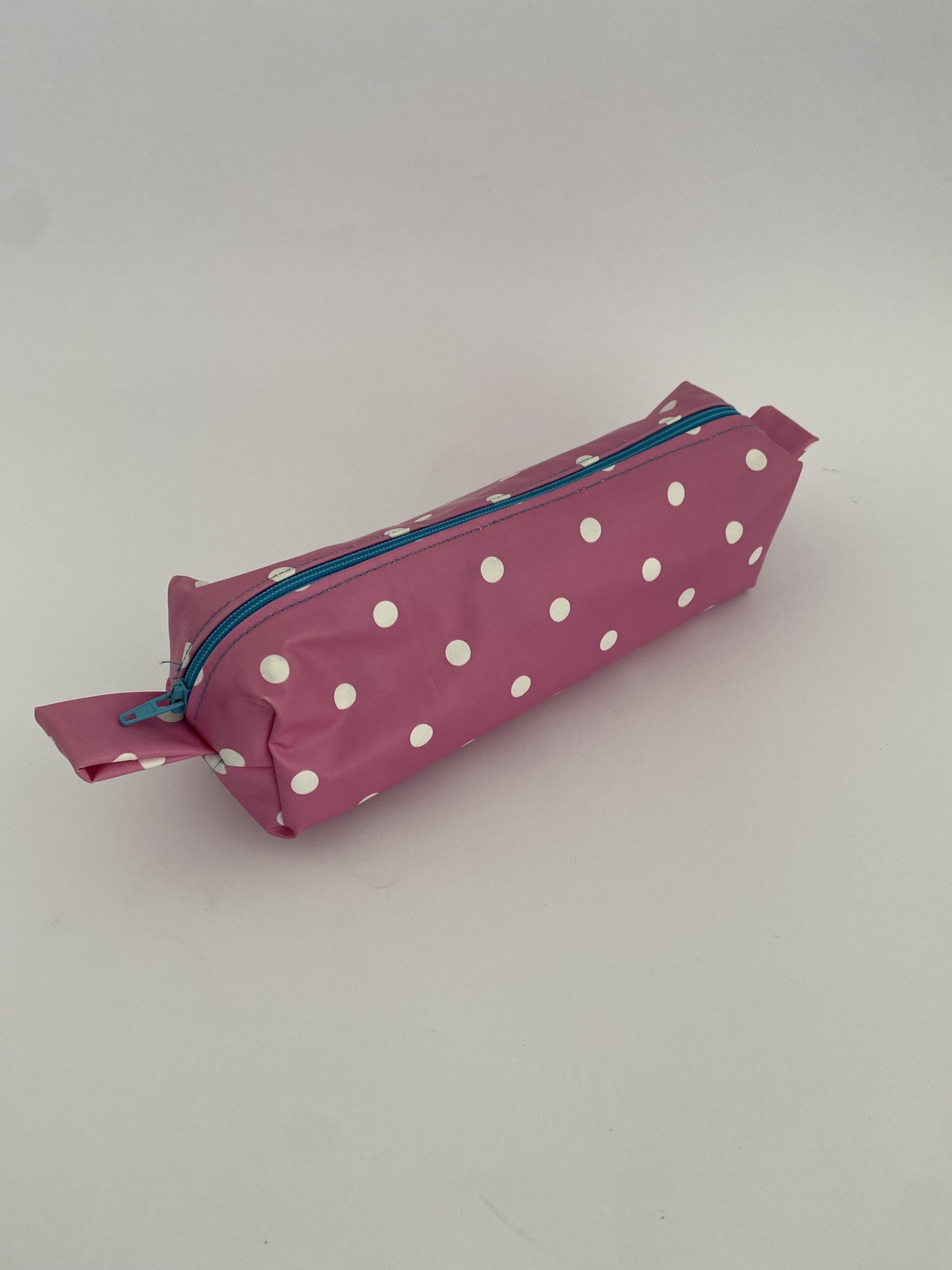 Estojo tecido plastificado rosa c/ bolas brancas.