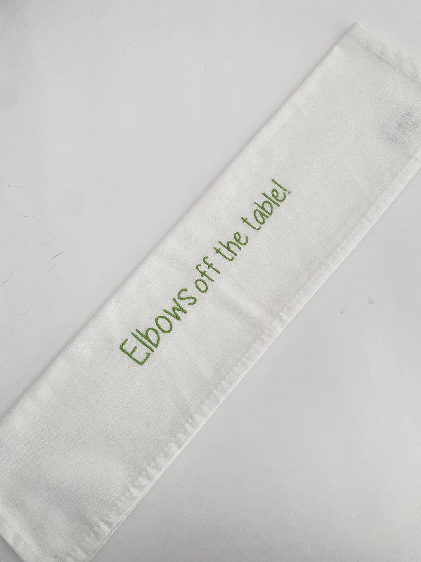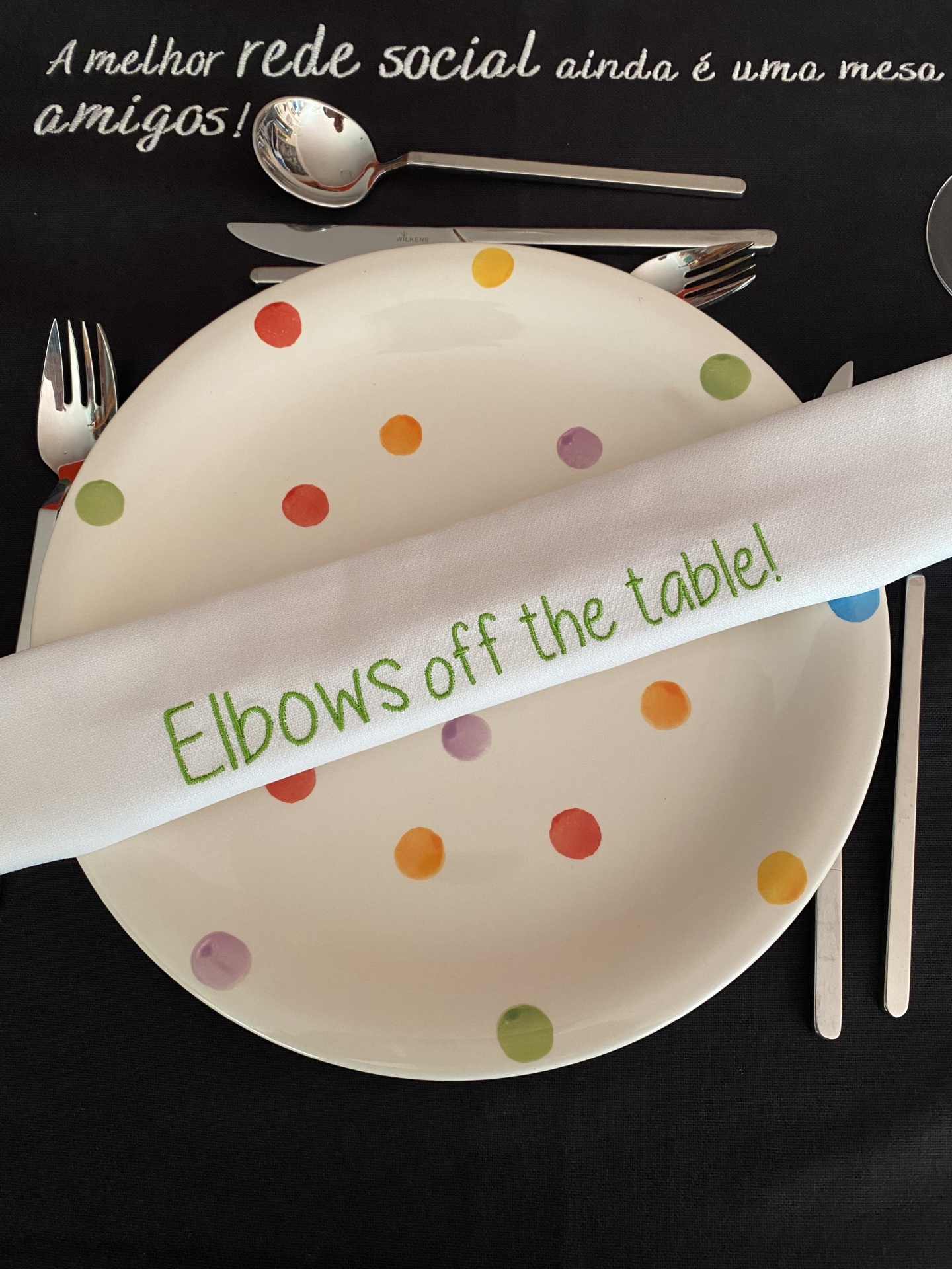 Home Guardanapos GUARDANAPO ''ELBOWS OFF THE TABLE'' GUARDANAPO ''ELBOWS OFF THE TABLE'' 7,50 € Desconto de %. Comprar Contactar Guardanapo branco com frase bordada a verde. Guardanapos de pano bordados fazem sempre uma mesa bonita! Dimensões aproximadas: 50cm x 48cm Tags Guardanaposguardanapos bordadosguardanapo personalizado Características Partilhar