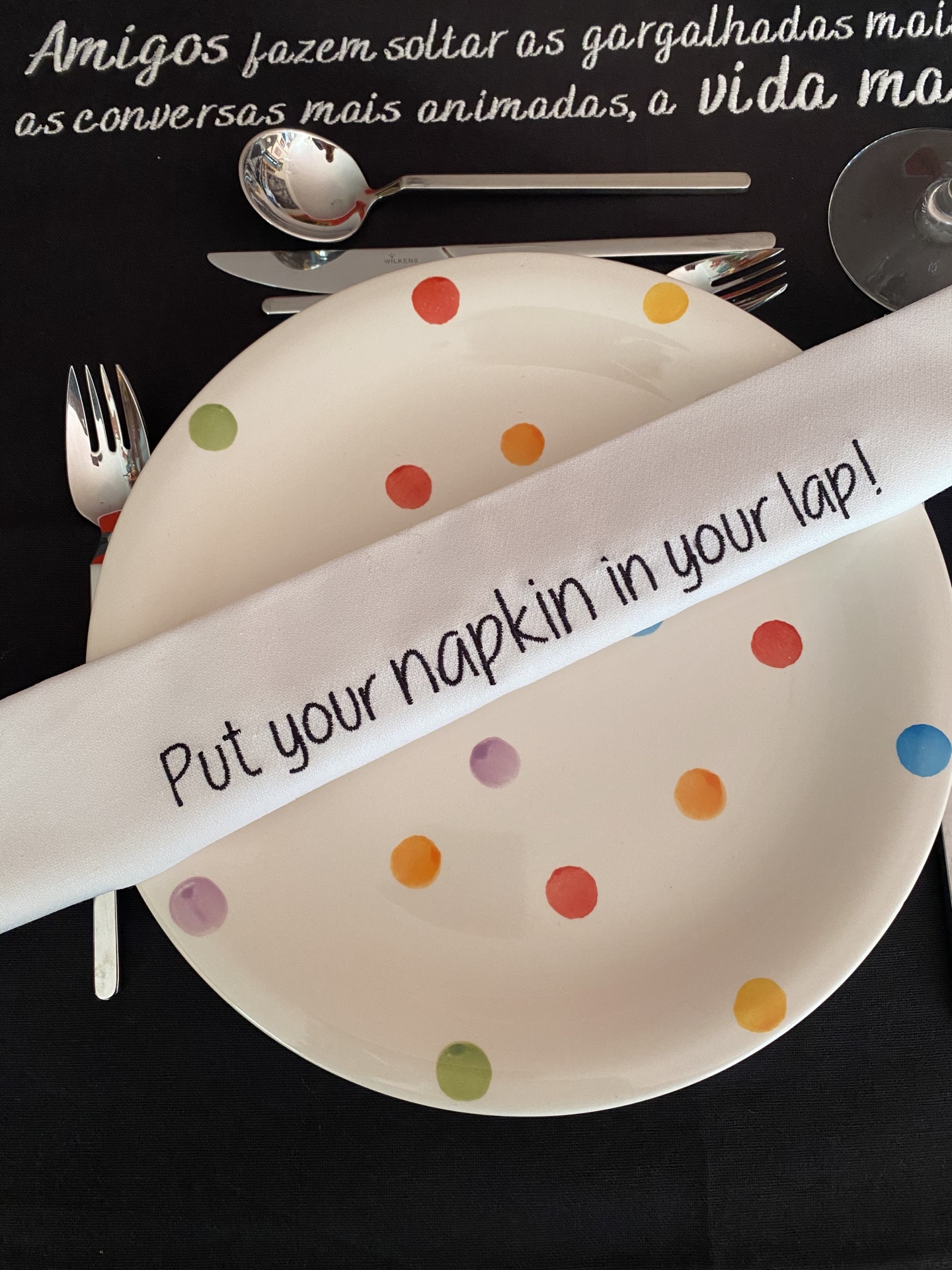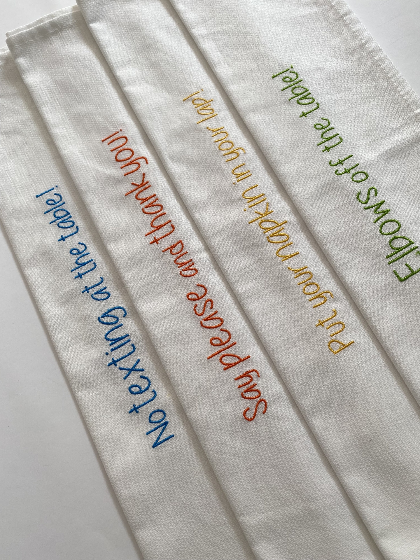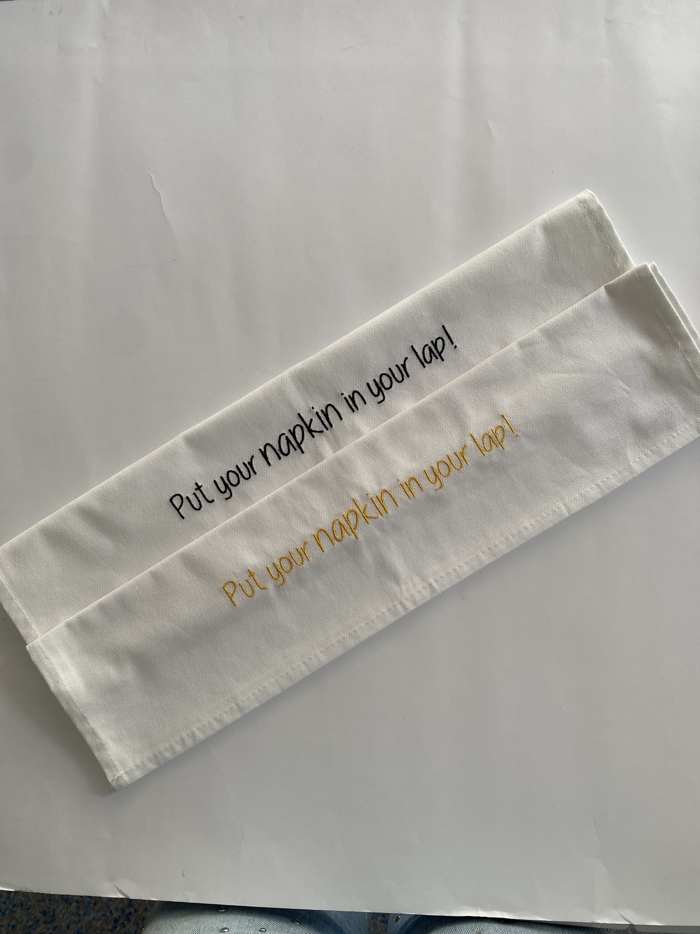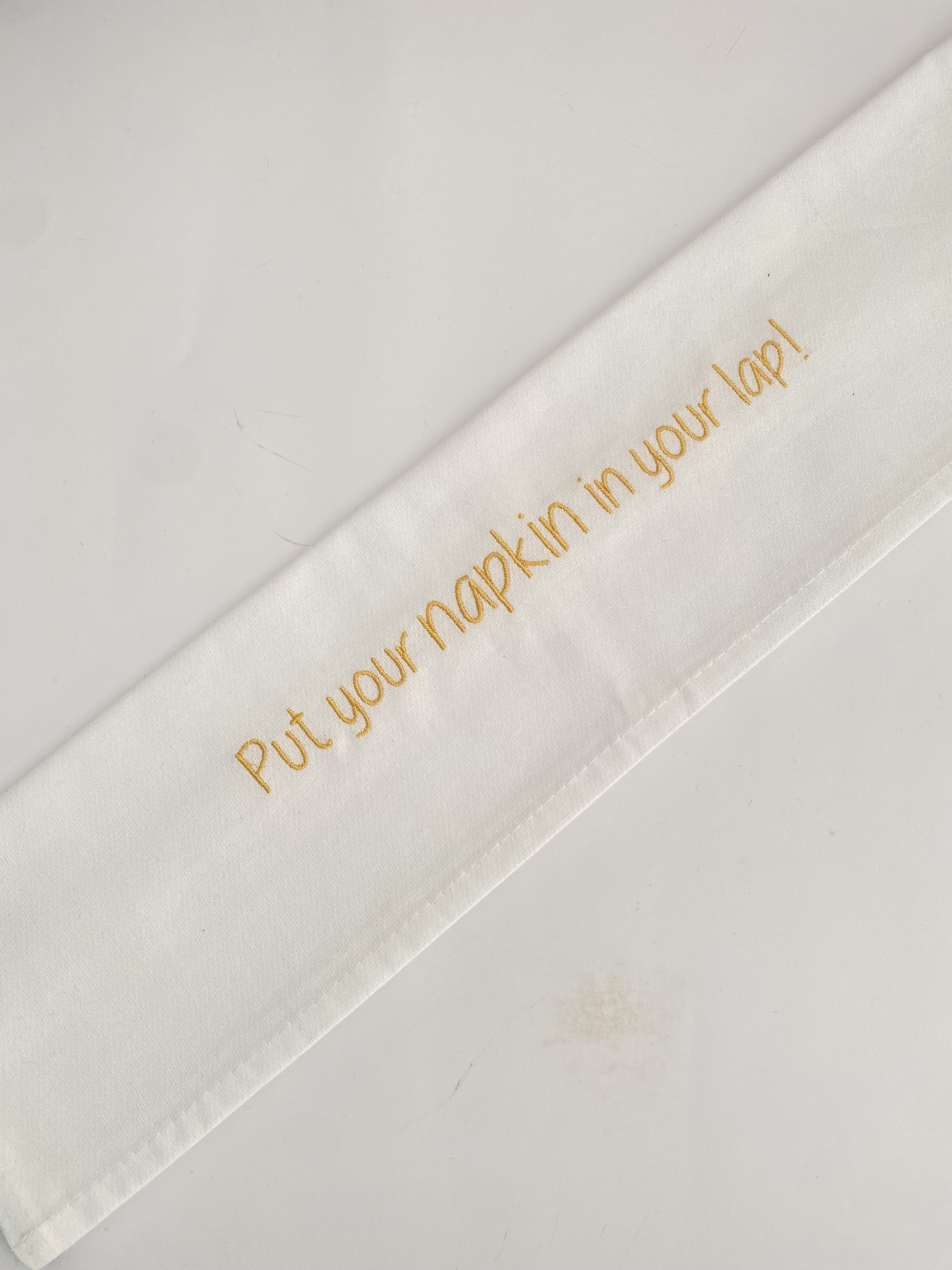 Home Guardanapos GUARDANAPO ''PUT YOUR NAPKIN IN YOUR LAP'' GUARDANAPO ''PUT YOUR NAPKIN IN YOUR LAP'' 7,50 € Desconto de %. Comprar Contactar Guardanapo branco com frase bordada a amarelo. Guardanapos de pano bordados fazem sempre uma mesa bonita! Dimensões aproximadas: 50cm x 47,5cm Tags Guardanaposguardanapos bordadosguardanapo personalizado Partilhar