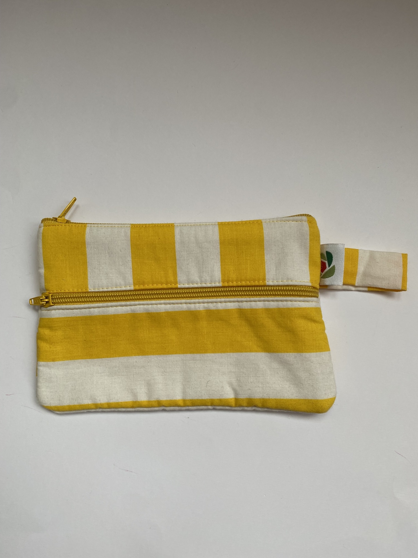 Nécessaire tecido riscas amarelo/branco c/ fecho duplo.