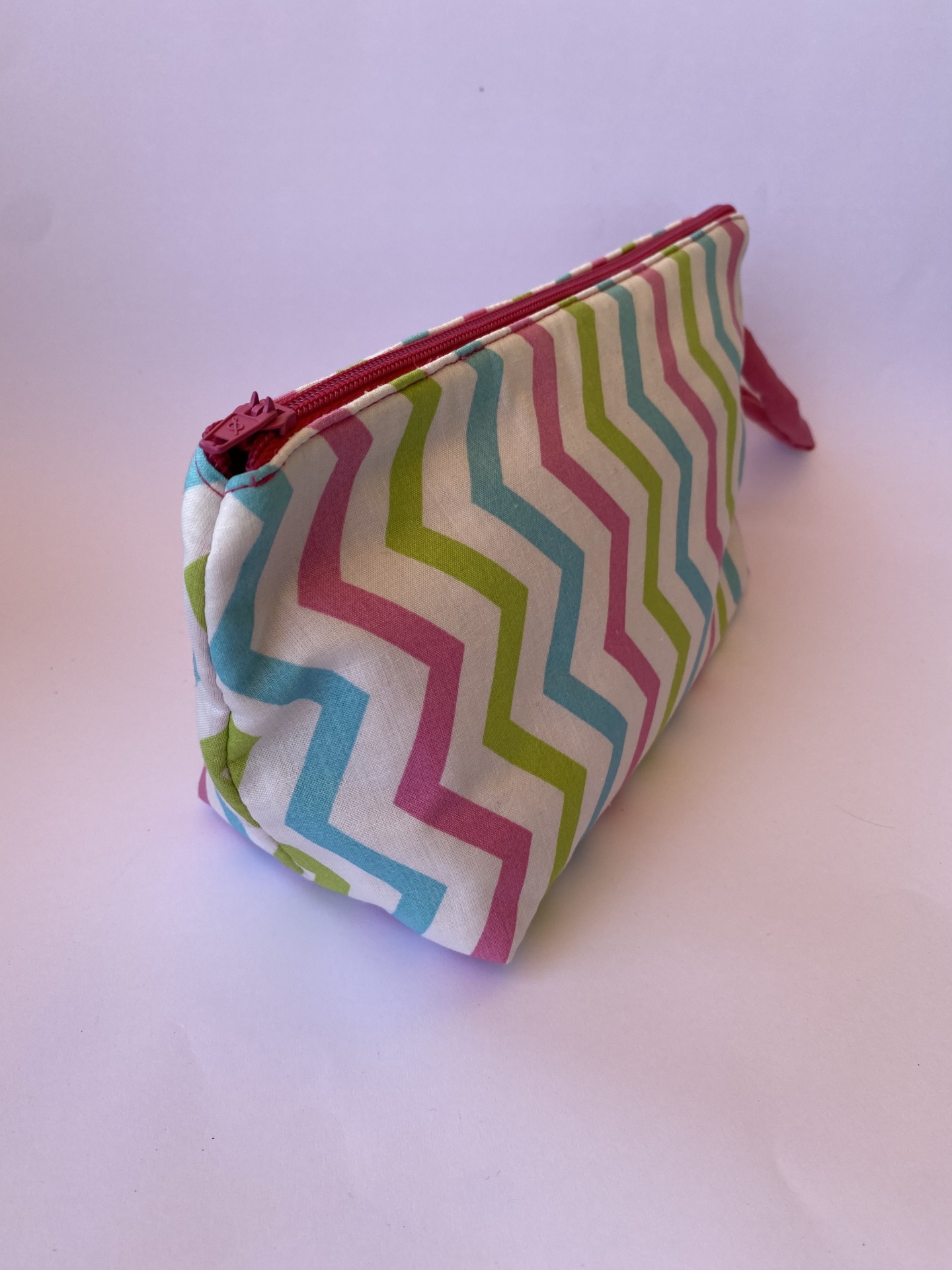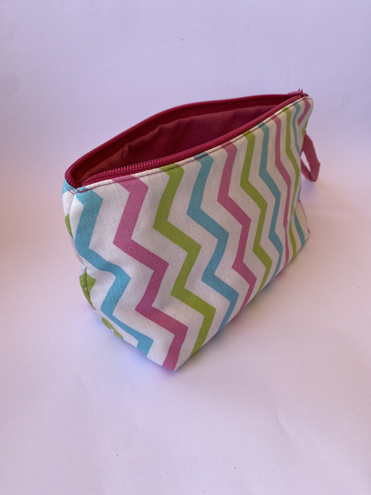Nécessaire tecido zebra nas cores azul turquesa/verde/rosa shocking e branco.