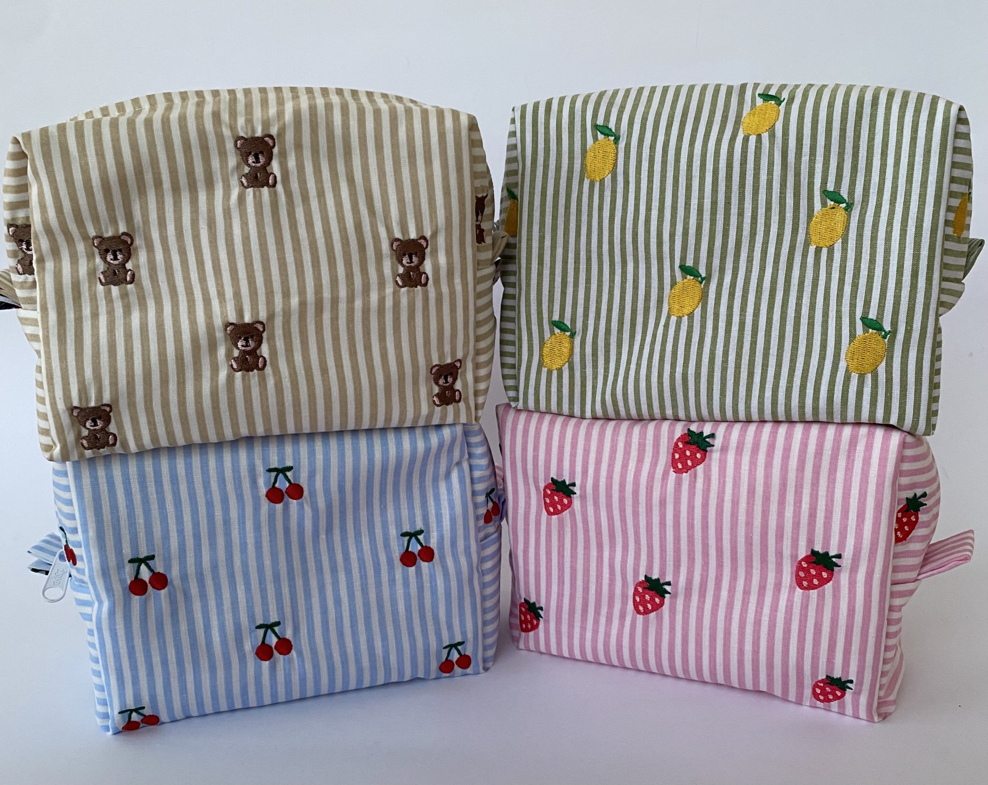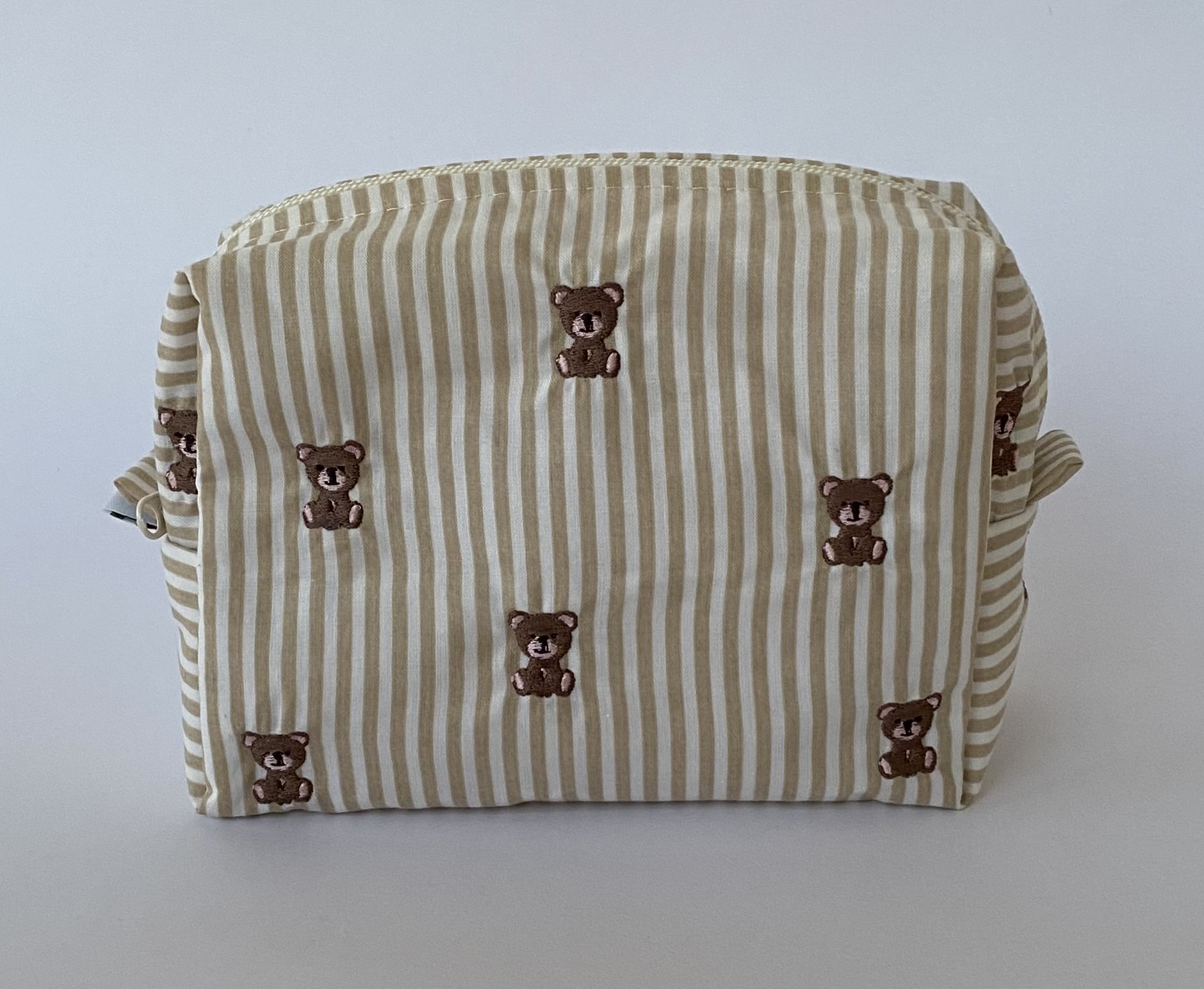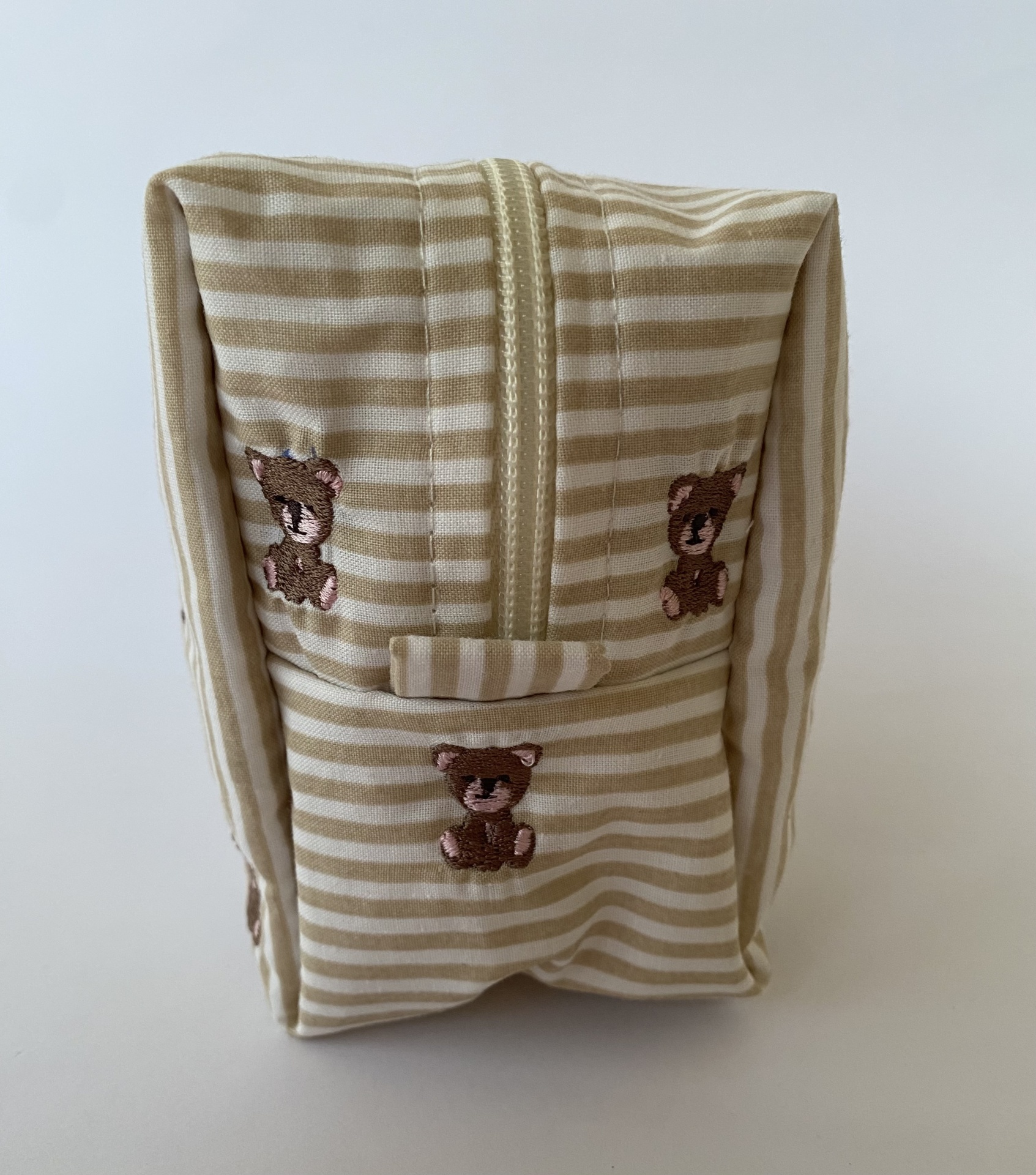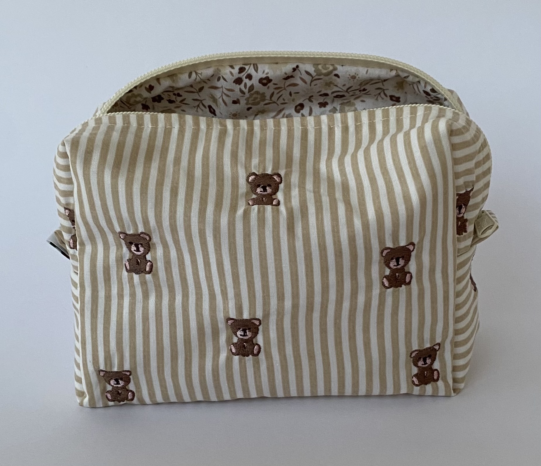 Apresenta um tecido exterior às riscas beges e brancas com ursinhos bordados dos dois lados. O tecido interior é floral em tons castanhos e beges. O fecho é bege.