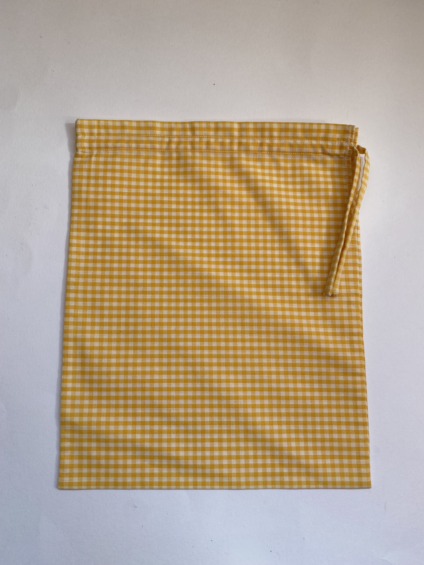 Saco de tecido xadrez amarelo/branco e atilhos amarelos.